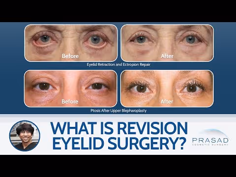 Dr. Prasad's technique and local anesthesia with LITE sedation allows patients to go home the same day and resume work and daily activities within A patient can suffer from two opposite problems at the same time, as seen in this case: a weak lifting muscle causing the eyelid to droop (ptosis), and a lack of skin preventing the eye from closing properly. This challenging issue is often the result of a previous surgery that failed to address both problems correctly. The restoration is therefore a complex, two-part solution. Dr. Prasad must first repair the lifting muscle to allow the eye to open, and then skillfully add new skin tissue so the eyelid can once again close fully and comfortably.